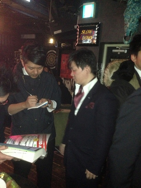 中に入ると知った顔が数人いて少し安心、カウンターの奥にJ氏が1人寂しそうに飲んでたので横に座って談笑。
